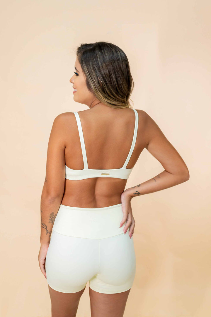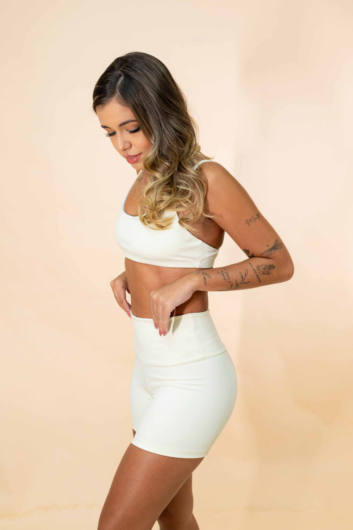 O top com alças finas e decote suave garante sustentação na medida certa e liberdade total de movimentos. Já o short de cintura alta modela sem marcar.
